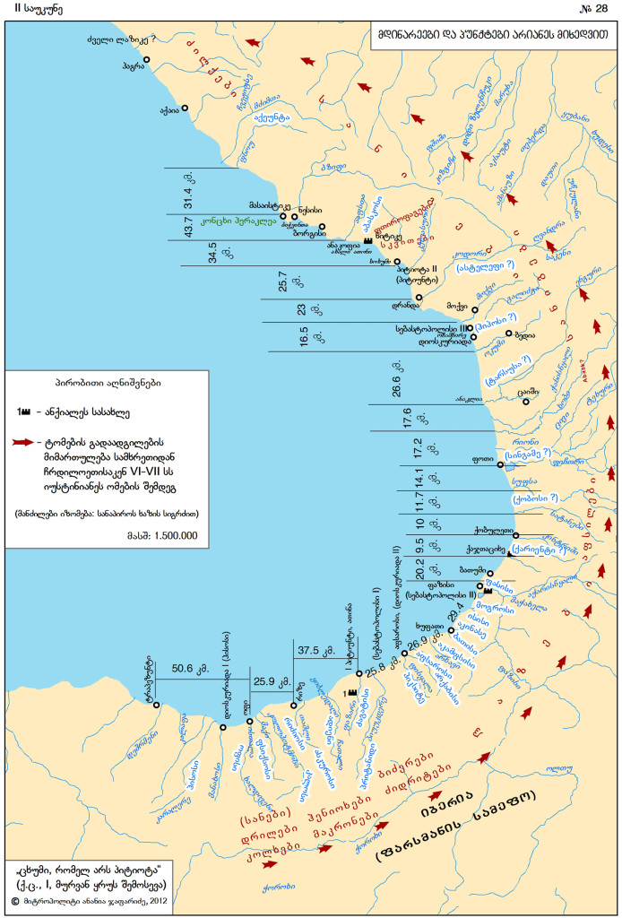 ხოლო ტრაპეზუნტიდან სებასტოპოლისამდე 2260 სტადიონი(18). სებასტოპოლისი ძველად დიოსკურიად იწოდებოდა, მილეტის ახალშენია(19). … დიოსკურიადადან პირველი სადგურია პიტიუნტში, 350 სტადიონის მანძილზე აქედან ნიტიფემდე 150 სტადიონია. აქ ძველად ცხოვრობდა სკვითთა ტომი, რომელსაც იხსენიებს ისტორიკოსი ჰეროდოტე, მათ ის გირჩისმჭამელებს უწოდებს (ფთიროფაგებს) (20).